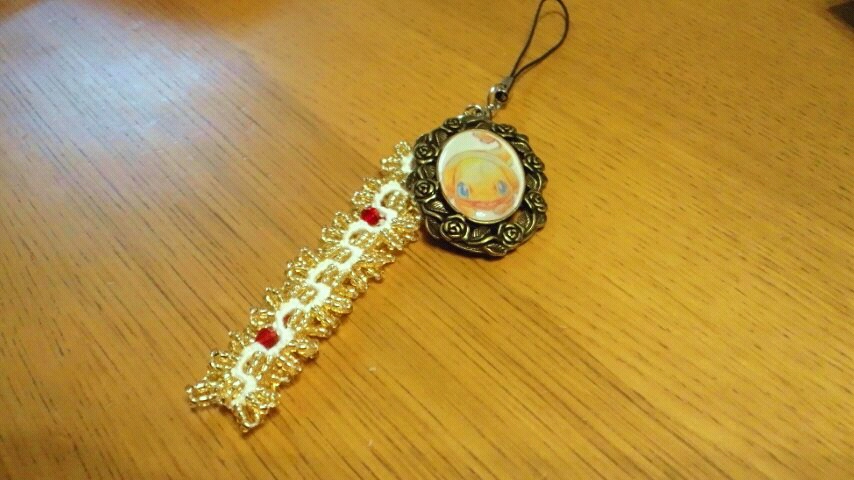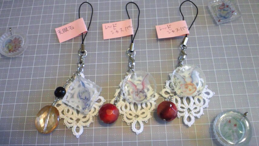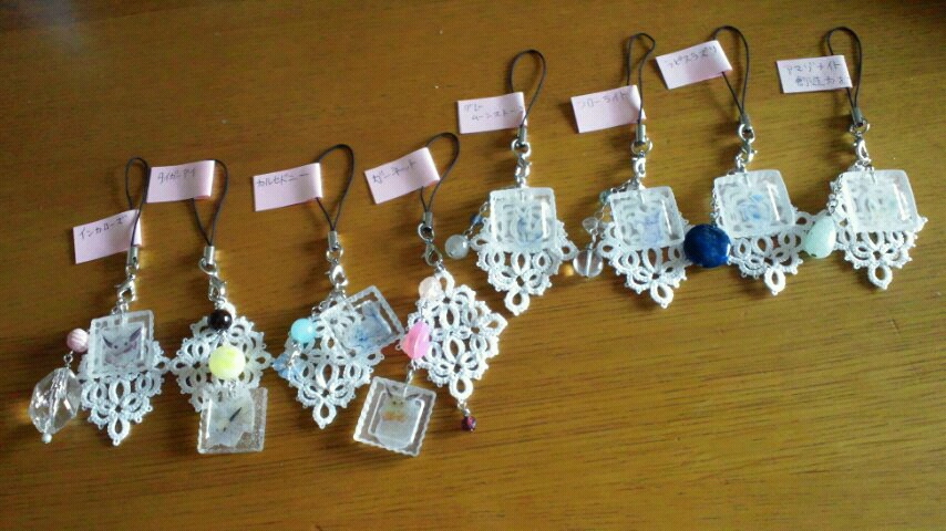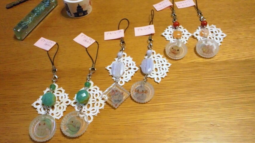 量産していたモチーフをレジン、石と繋げてストラップにしました。