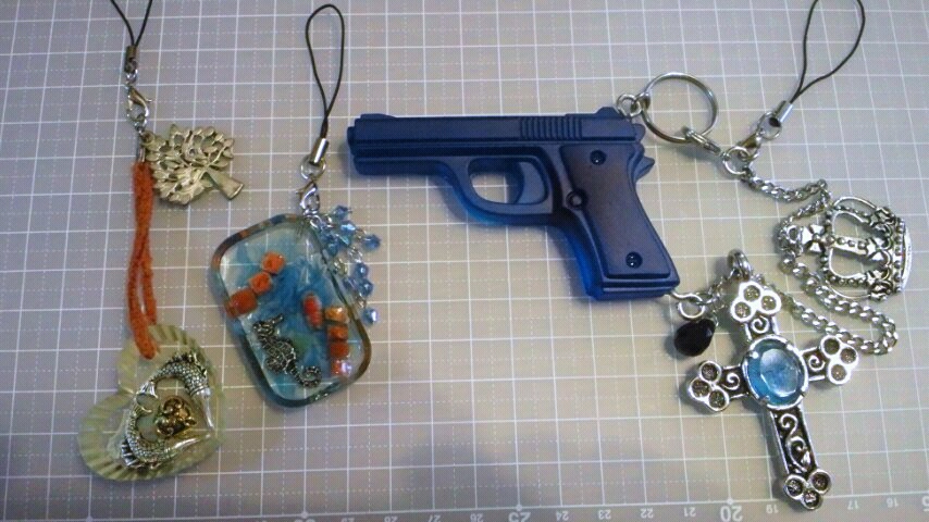 右のピストルのは、長めのチェーンに色々着けてみました。