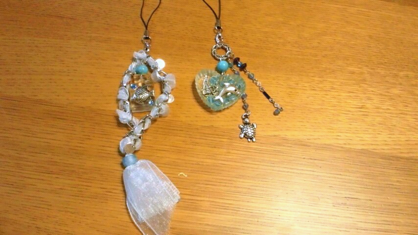 中央のタツノオトシゴのストラップには珊瑚が入っています。