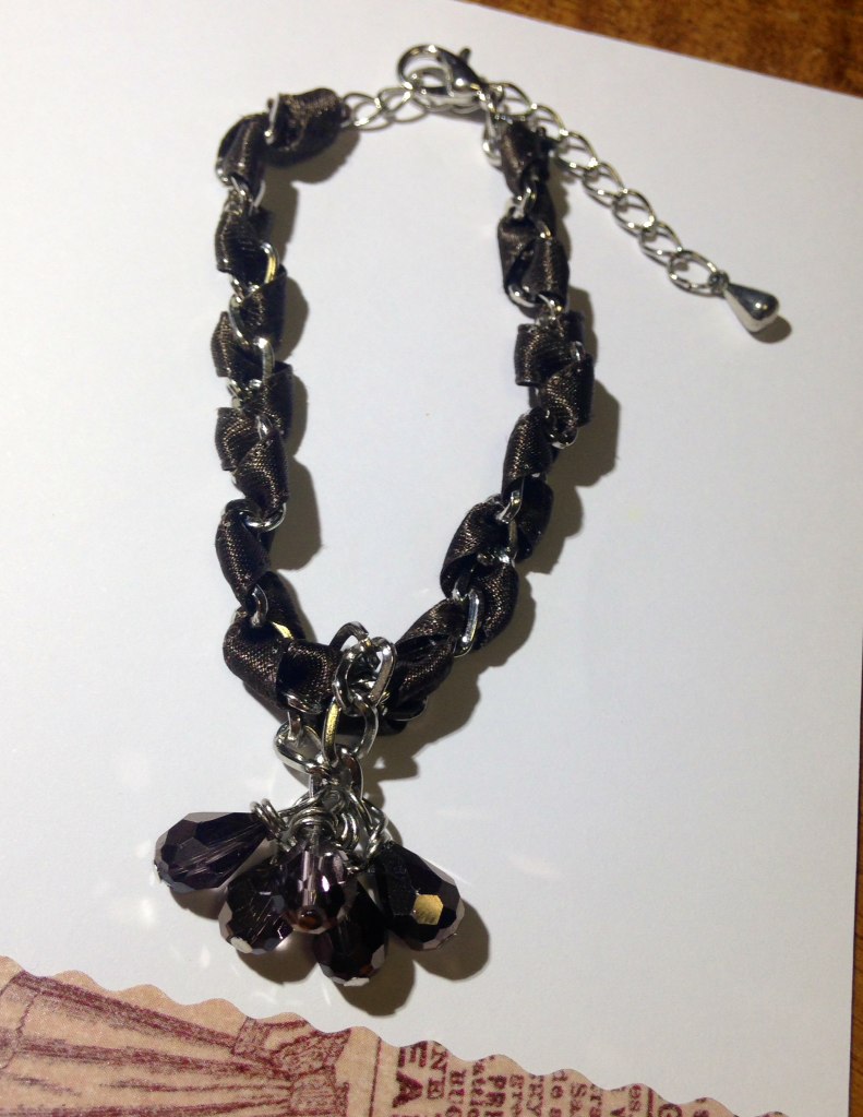 シルバーのチェーンにリボンを編み込んだ物。