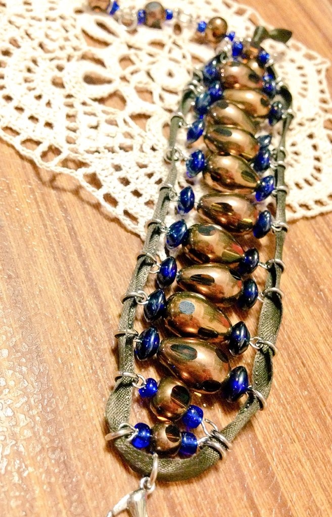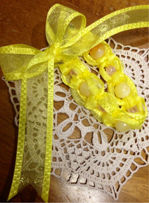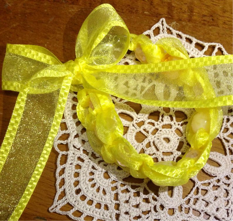サテンリボンとビーズを編んだ物。