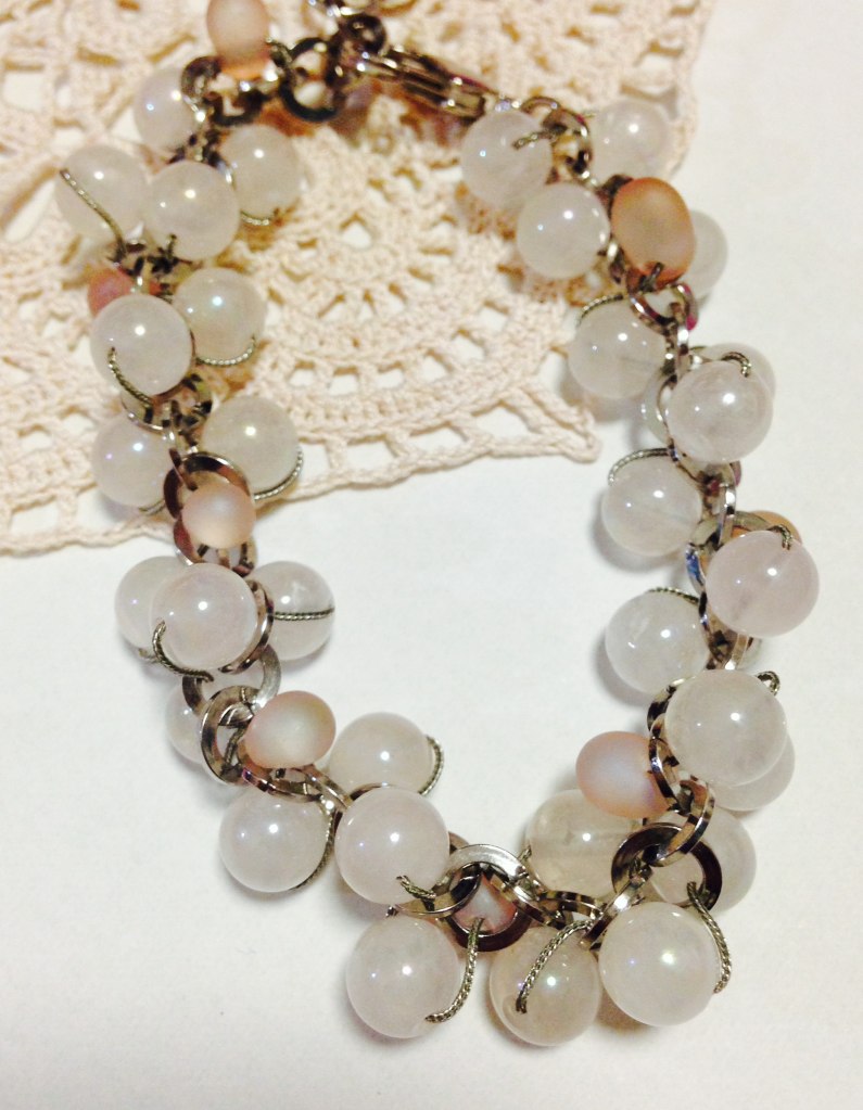 チェーンにローズクオーツを編み込んだ物。