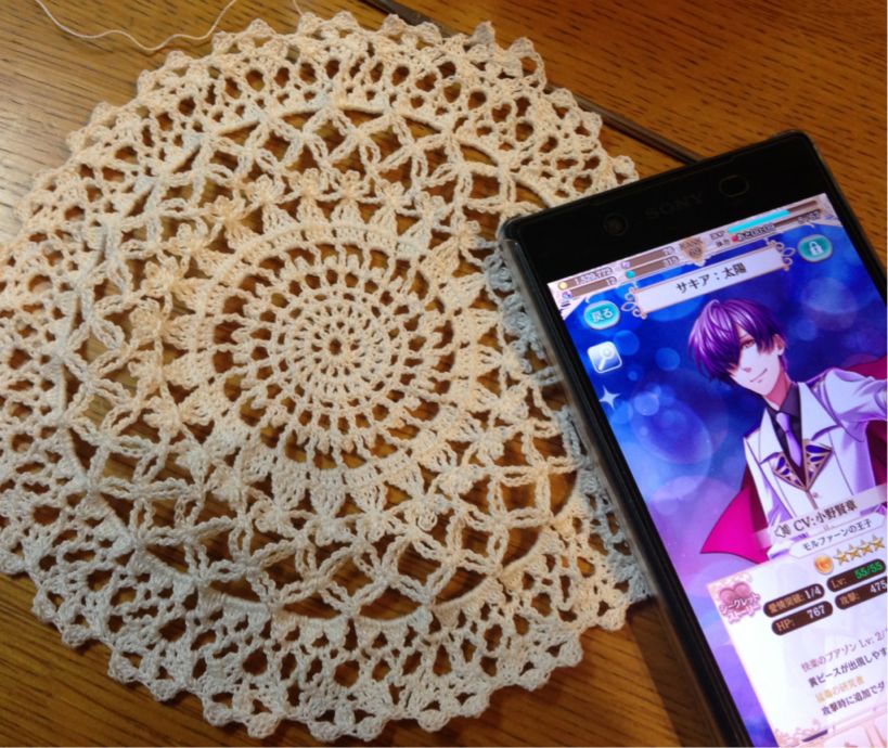 これ、編んでる途中で新しいスマホ手に入れて新しいアプリゲームに手を出したんです。