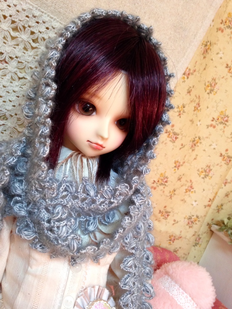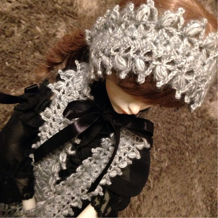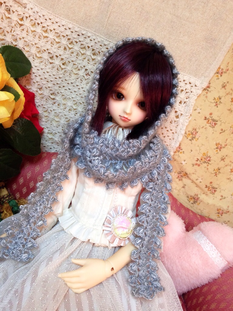 お姉さんがヘアバンドみたいに頭に巻いて方から前に垂れるのに憧れて編んだんですが、実際編み上げてみると厚みもあるし柔らかさが足りなかった気がします。