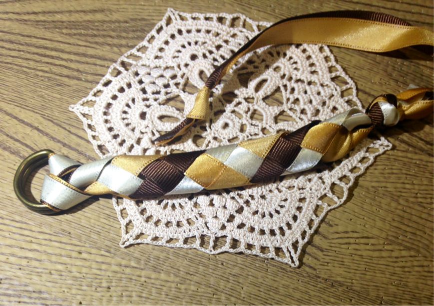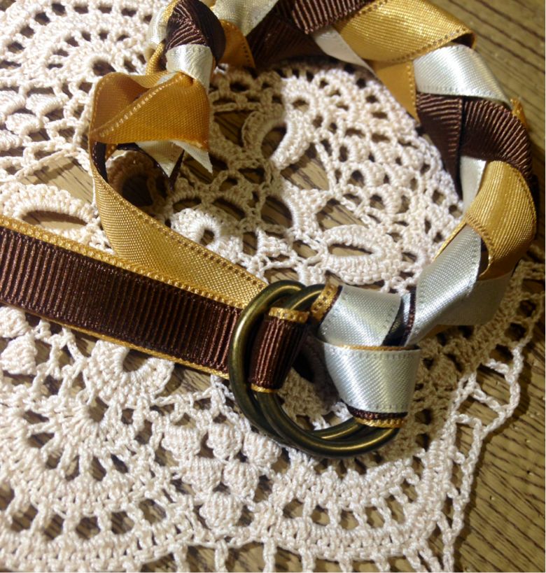 ゴールドのチェーンにリボンとレース糸を編み込んだ物。