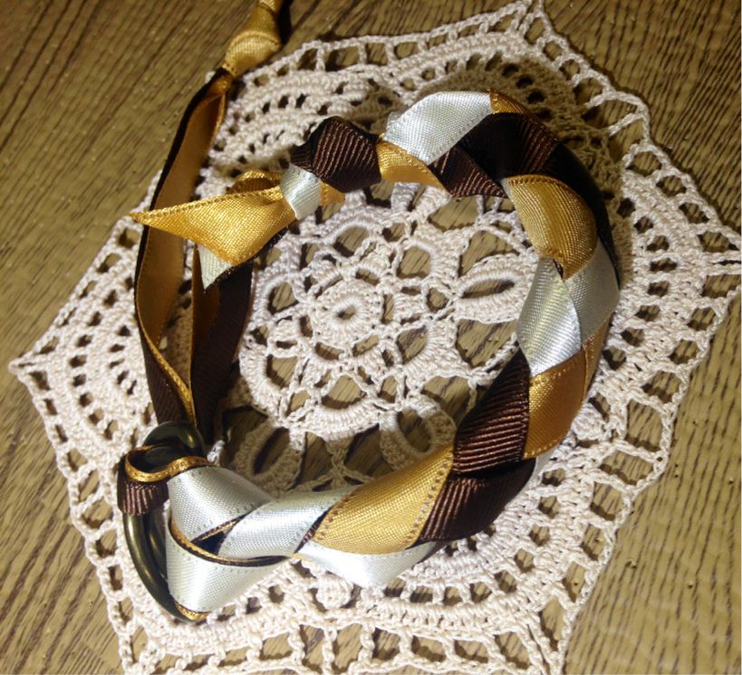 ゴールドのチェーンにリボンを編み込んだ物。