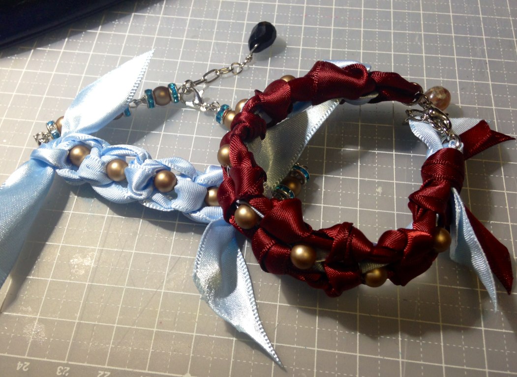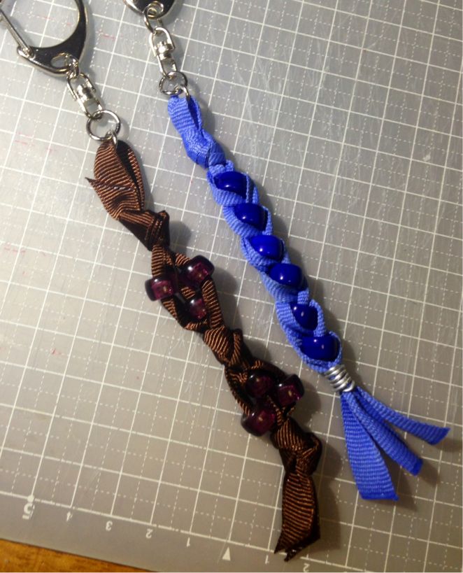 サテンリボンとビーズを編んだ物。