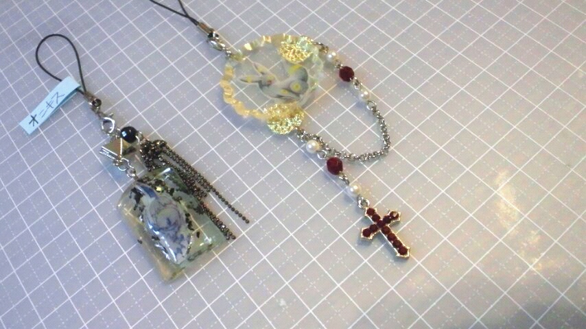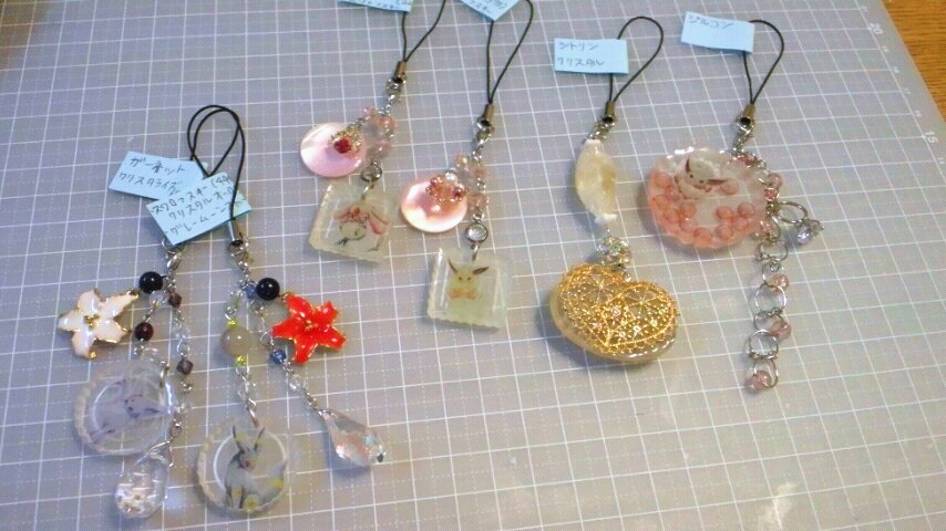 中二つは白蝶貝+チャーム+スワロのつなぎパーツ