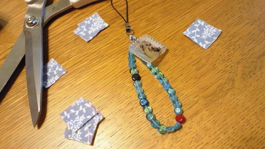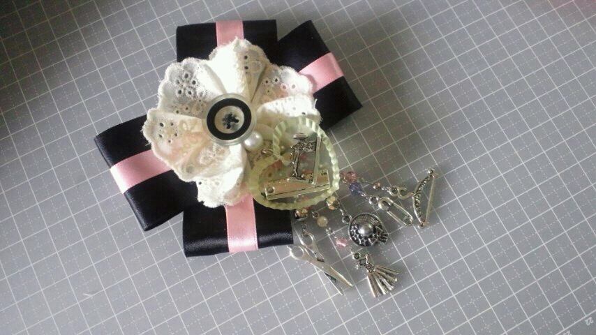 土台のリボンから中央のボタン、ビーズに至るまで全部、ウチにあったもの。